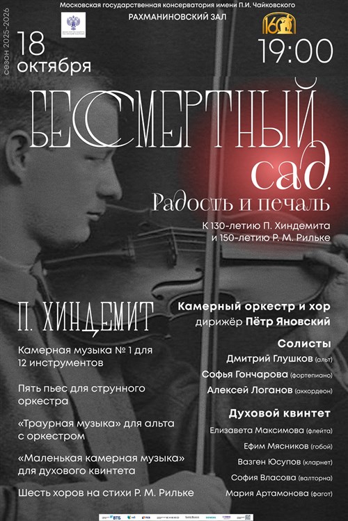 П. Хиндемит Камерная музыка № 1 для 12 инструментов «Траурная музыка» для альта с оркестром Пять пьес для струнного оркестра «Маленькая камерная музыка» для духового квинтета Шесть хоров на стихи Р.М. Рильке
