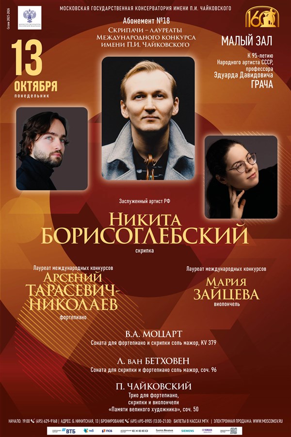 Абонемент № 18 Московской консерватории представляет скрипачей – лауреатов Международного конкурса имени П. Чайковского. Откроет концертную серию выступление заслуженного артиста России Никиты Борисоглебского, завоевавшего в 2007 году на XIII конкурсе им. Чайковского II премию и пять специальных призов.