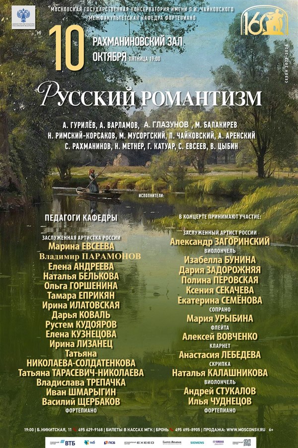 Программа «Русский романтизм» Межфакультетской кафедры фортепиано предлагает проследить за сюжетными коллизиями, связанными единой стилистической линией, в различных ансамблевых вариациях и сольных произведениях для фортепиано, от истоков направления в начале XIX века до музыки первой трети XX столетия. Прозвучит музыка композиторов: А. Гурилева, А. Варламова, М. Балакирева, Н. Римского-Корсакова, М. Мусоргского, П. Чайковского, А. Глазунова, А. Аренского, С. Рахманинова, Н. Метнера, С. Евсеева, В. Цыбина.