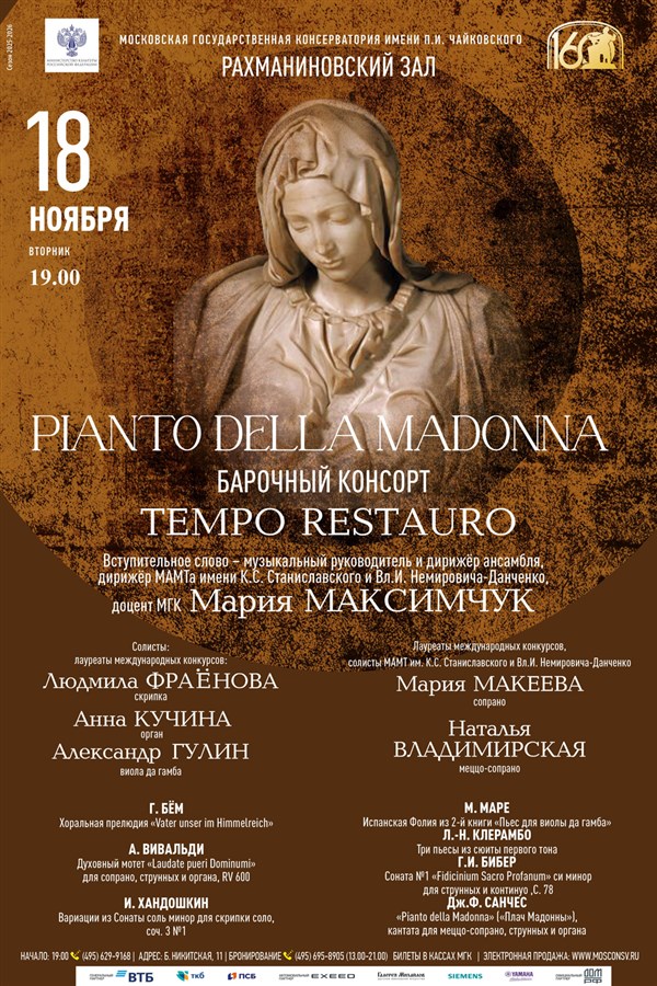 Настоящим подарком меломанам станет раритетный шедевр, отразивший уходящий век Ренессанса и наступающую эпоху барокко, кантата Дж.Ф. Санчеса «Pianto della Madonna» («Плач Мадонны») и непопулярное сочинение популярного автора - духовный мотет А. Вивальди “Laudate pueri Dominumi” – из собрания духовных мотетов собора св. Марка в Венеции.