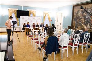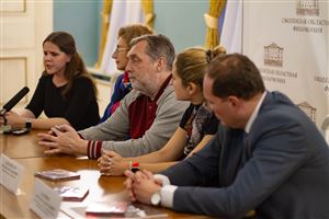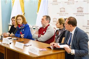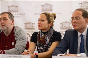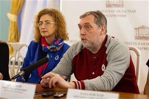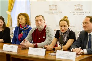 4 октября в музыкальной гостиной Смоленской филармонии прошла пресс-конференция с авторами проекта «Дорогами Высоцкого», профессорами Московской консерватории Е.Д. Кривицкой, А.В. Соловьевым и директором дома-музея Владимира Высоцкого, сыном поэта Н.В. Высоцким. В ней также приняли участие исполнительный директор форума «Партитура будущего», доцент Московской консерватории Я.А. Кабалевская и председатель студенческого совета консерватории М. Глазкова.