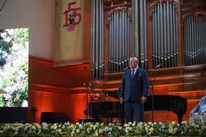 Церемония открылась поздравительным словом Владимира Путина, которое зачитал советник Президента Российской Федерации по вопросам культуры Владимир Толстой. «Консерватория гордится многими поколениями своих выпускников, – говорится в поздравлении Президента. – Убеждён, что вы и впредь будете высоко держать планку родной альма-матер, впишете немало ярких музыкальных нот в её богатую творческую летопись».