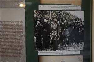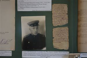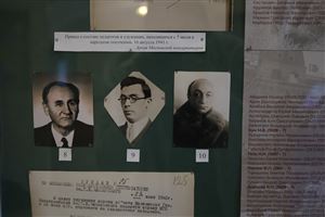 Включенный в выставку ряд приказов военного времени лучше всего иллюстрирует повседневную жизнь Консерватории в этот непростой период: даны и важнейший приказ о числящихся в народном ополчении, и приказы о призванных в ряды РККА, о тушении зажигательных бомб, о строительстве бомбоубежищ, о трудовом фронте и т.д. Приказы же завершающего периода вызывают противоречивые эмоции и демонстрируют глубину изменений, принесенных войной: приказ о возобновлении работы Оперной студии, о вручении медалей «За оборону Кавказа» и здесь же – список инвалидов Отечественной войны. Один из стендов посвящен концертно-фронтовым бригадам Московской консерватории и теме музыки на войне. Приказы Комитета по делам искусств и Московской консерватории дают представление о составах и условиях работы фронтовых бригад. Сопровождаются они соответствующими афишами и фотографиями: концертные бригады на Черноморском флоте, на Калининском фронте, в Саратове, Ленинграде и т.д. Три стенда на выставке освещают подвиг сотрудников Московской консерватории Г.П. Лузенина и А.И. Окаемова, которые, отказавшись от брони, в числе первых записались добровольцами в 8 ДНО. После поражения дивизии под Смоленском, они попали в Кричевский лагерь смерти в Белоруссии. Там они сотрудничали с подпольной антифашистской организацией. Немцы заставляли военнопленных восстанавливать цементный завод, но Лузенин с Окаёмовым проводили работу по выведению машин из строя. Кроме того, они передавали партизанам добытые ими значимые стратегические сведения, в том числе и через зашифрованный репертуар созданного ими самодеятельного хора пленных. Подвигу ополченцев А.И. Окаёмову и Г.П. Лузенину, в г. Кричев названы 2 улицы в их честь и воздвигнуты 2 памятника (один на братской могиле, другой – на месте их гибели).