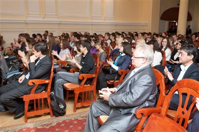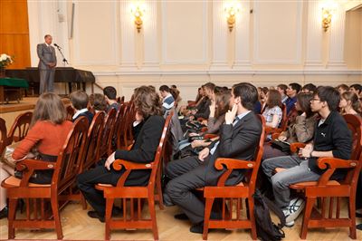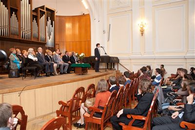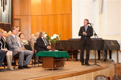 С началом учебного года первокурсников поздравляет ректор Московской консерватории, профессор Александр Сергеевич СоколовС началом учебного года первокурсников поздравляет ректор Московской консерватории, профессор Александр Сергеевич Соколов.Выступает заместитель министра культуры Российской Федерации Андрей Евгеньевич Бусыгин.С напутственным словом первокурсникам обращается заместитель министра культуры Российской Федерации Андрей Евгеньевич БусыгинОт лица первокурсников выступает студент 1 курса композиторского факультета, лауреат V и VI Всероссийских конкурсов по теории и истории музыки и композиции им. Ю.Н. Холопова Александр ТлеуовТоржественное собрание в Малом зале консерватории, посвященное началу учебного года; 3 сентября 2012 г.Первокурсников поздравляет председатель Студенческого профсоюзного комитета Московской консерватории, выпускник фортепианного факультета, лауреат международных конкурсов Самсон Цой.Выступает лауреат международных конкурсов, аспирантка Московской консерватории Ирина Сопова (альт).